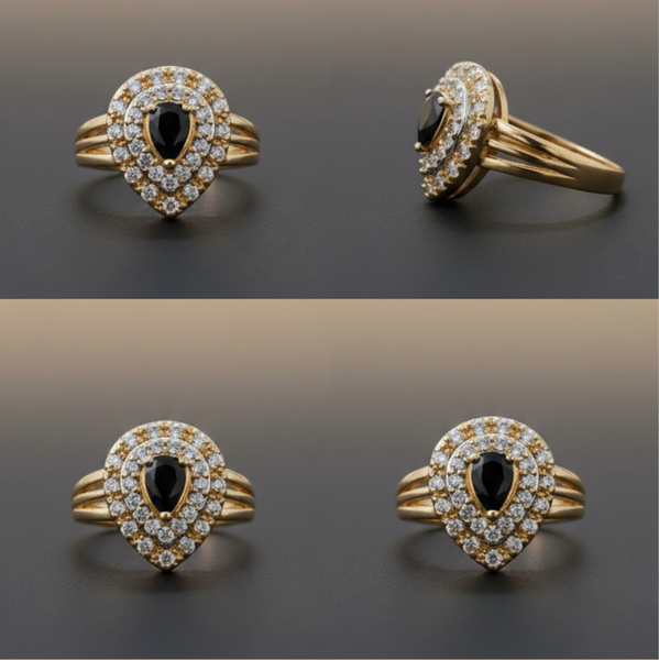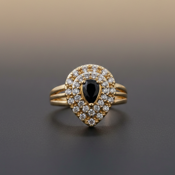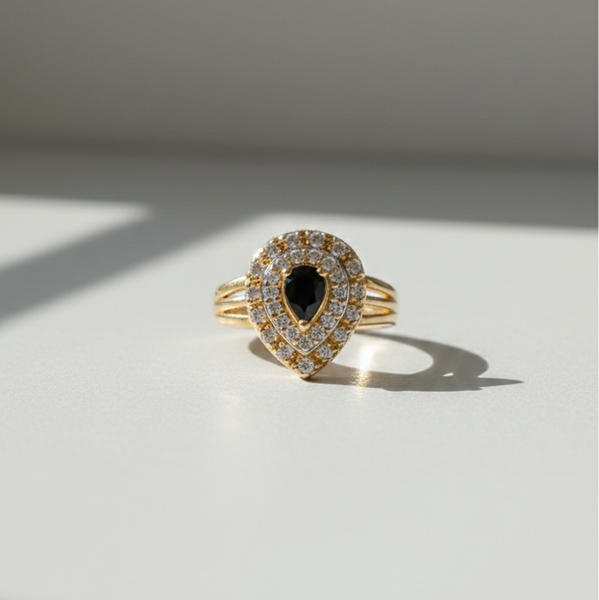 Embrace timeless elegance with this exquisite 1 carat black onyx teardrop ring, featuring a stunning double halo design in luxurious gold.