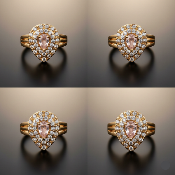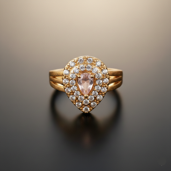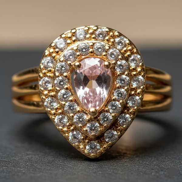 Experience romantic elegance with this exquisite 1 carat rose quartz teardrop ring, featuring a stunning double halo design in luxurious rose gold.
