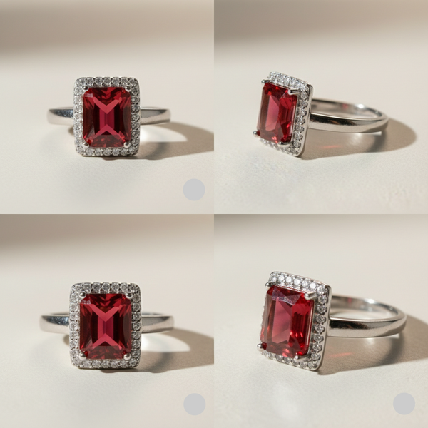 Make a bold statement with this stunning adjustable ring featuring a brilliant ruby red emerald-cut center stone surrounded by a sparkling diamond halo.